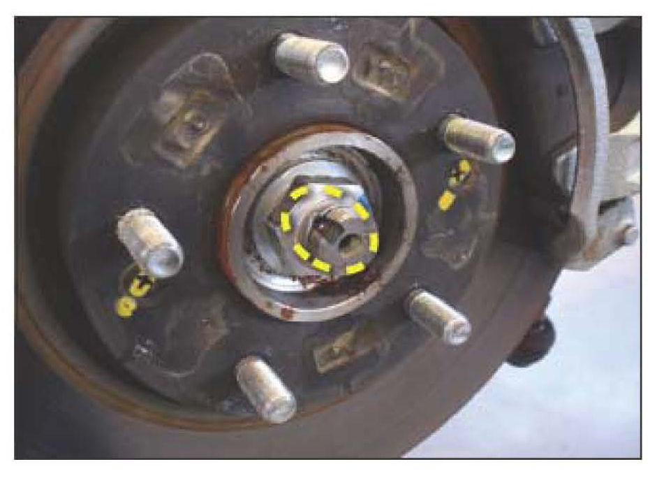 4. Un-stake the axle nut using tapered punch. This will prevent the axle nut threads from getting damaged during removal. Remove and discard the retaining nut, do not reuse.