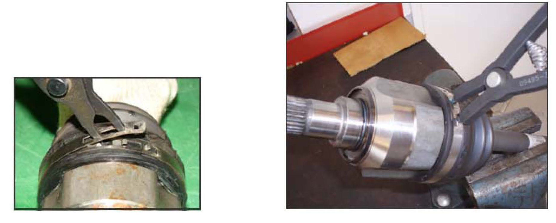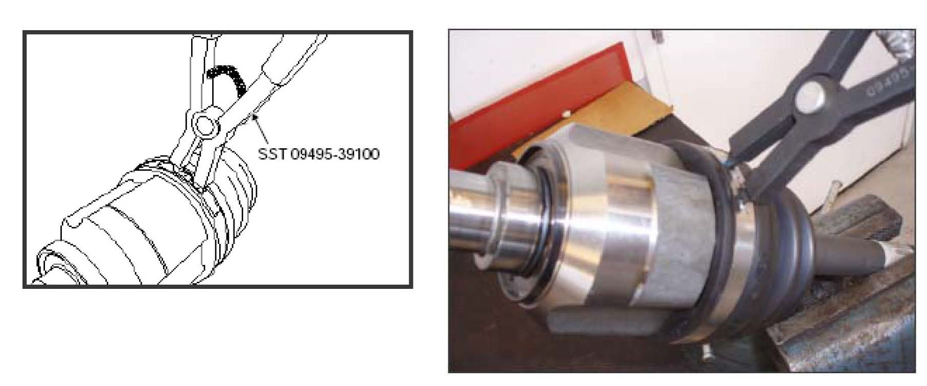 10. Clamp the axle joint into the vise to stabilize the assembly for inner tri-pod housing replacement. Remove the outer band clamp using SST 09495-39100. Remove and discard the inner tri-pod housing.