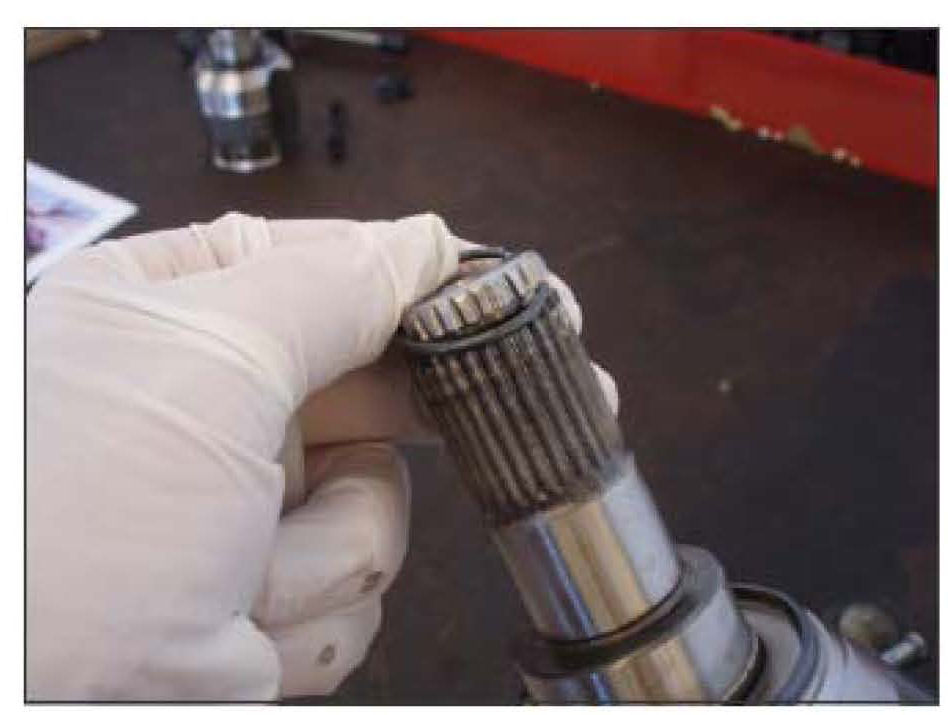 15. Install a new spring clip onto the end of the inner CV joint splines. The axle assembly is ready to be installed into the transaxle assembly.