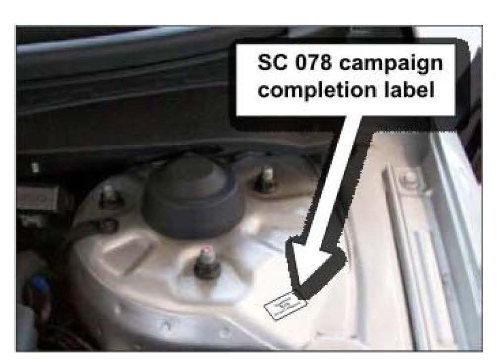 1. Open hood and check for SC078 Campaign completion label on the strut tower behind the fuse box. If the label exists, NO FURTHER ACTION IS REQUIRED.