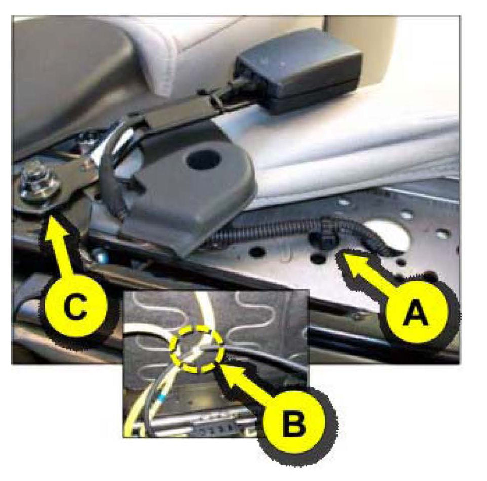 ^ Cut tie wrap that secures harness under seat bottom (B),
