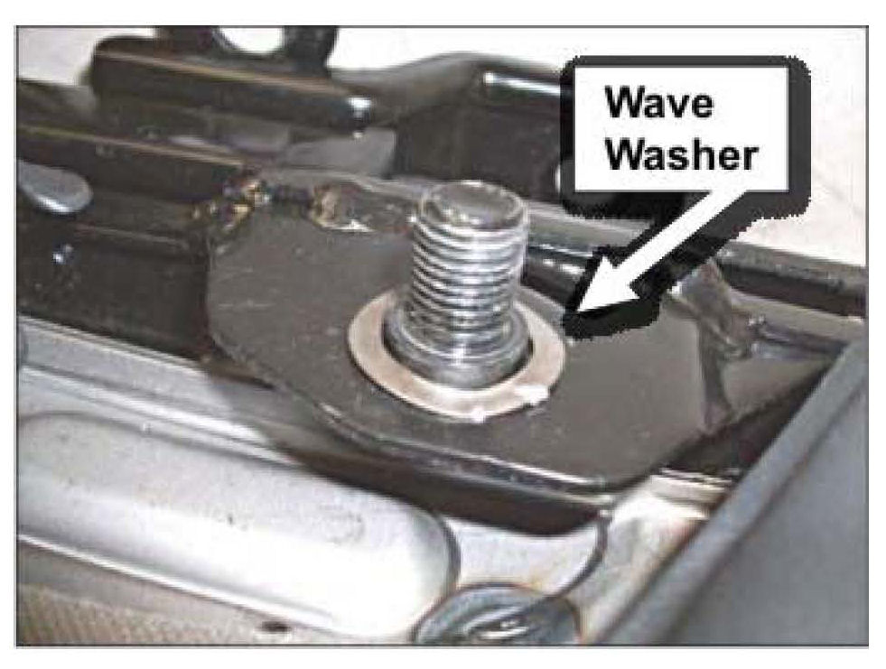 6. Make sure that wave washer has not fallen off of mounting post and is in place before installing new seat belt buckle assembly.