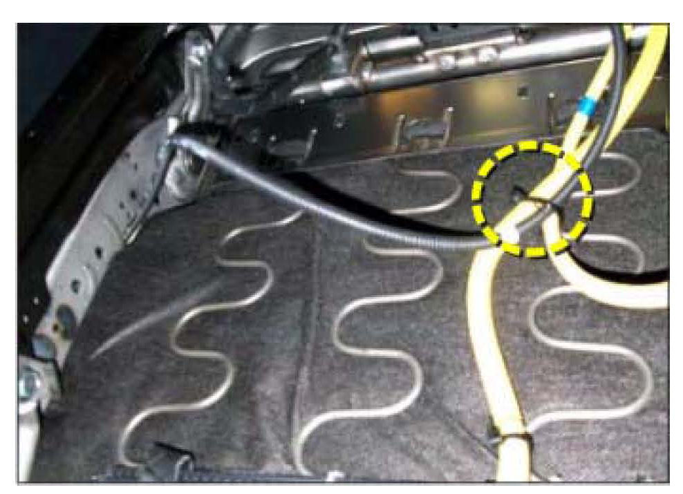 9. Use a new plastic tie wrap to secure wire harness to underside of seat as indicated in photo.