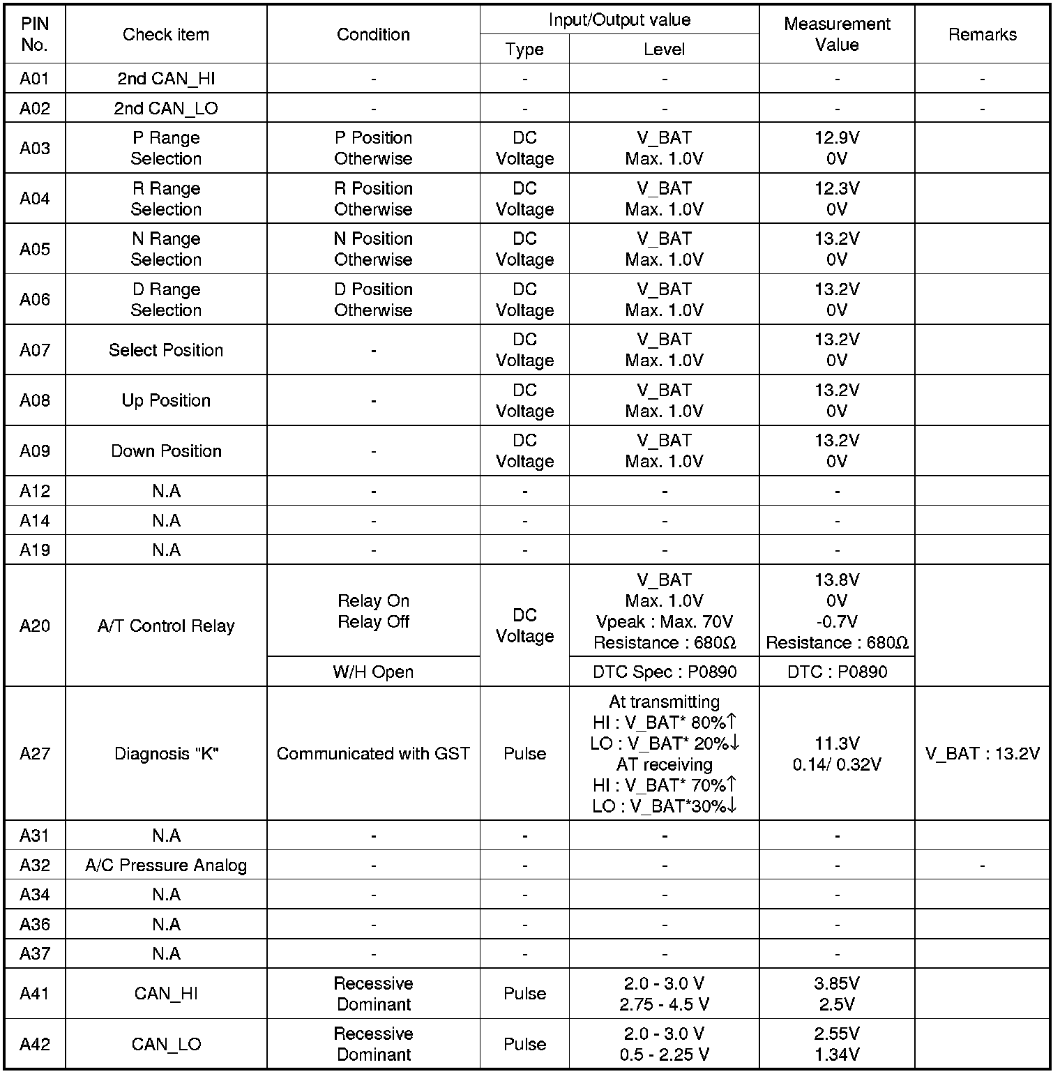 Pinout Values and Diagnostic Parameters