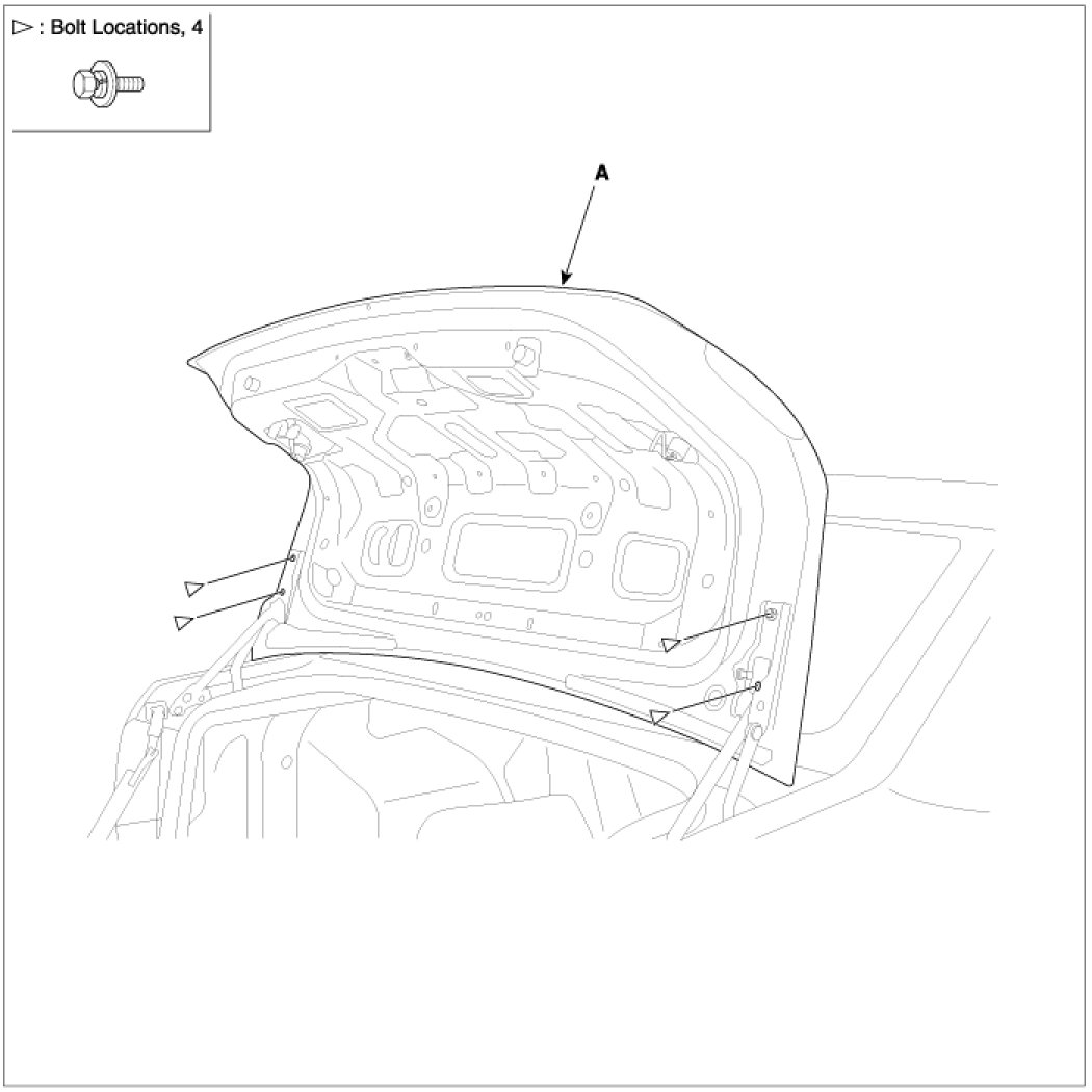6. After loosening the mounting bolt, then remove the trunk lid assembly (A).