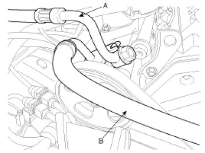 2. Disconnect the pressure tube (A) and suction tube (B) from the power steering oil pump.