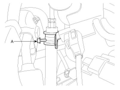 1. Drain the power steering fluid by disconnecting return hose (A).