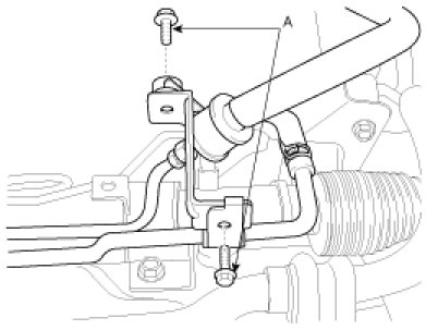 5. Remove the pressure and return tube bracket bolts (A).