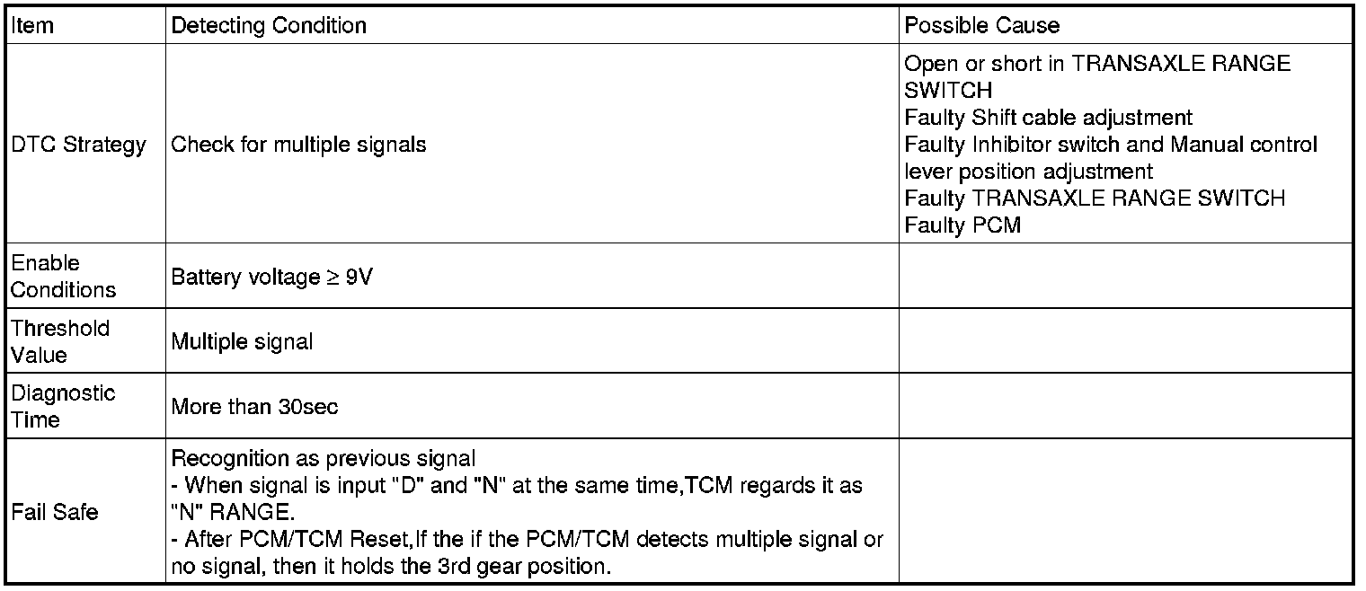 The PCM/TCM sets this code when the Transaxle Range Switch outputs multiple signals for an extended period of time.