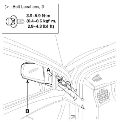 2. After disconnecting the connector (A), remove the outside rear view mirror (B).