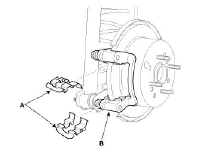 4. Install the brake pads (B) and pad shim (A) on the caliper bracket.