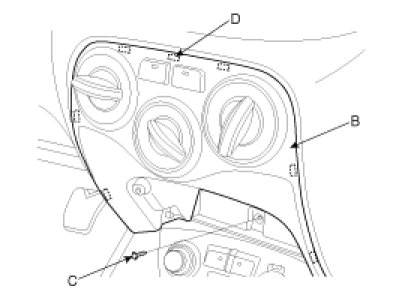 3. Remove the center facia lower panel (B) by pulling it using a screw driver (-) after loosening a screw (A). Avoid damaging retaining clips.