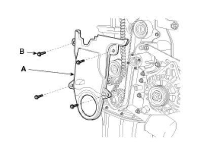 13. Remove the 4 bolts(B) and timing belt lower cover(A).