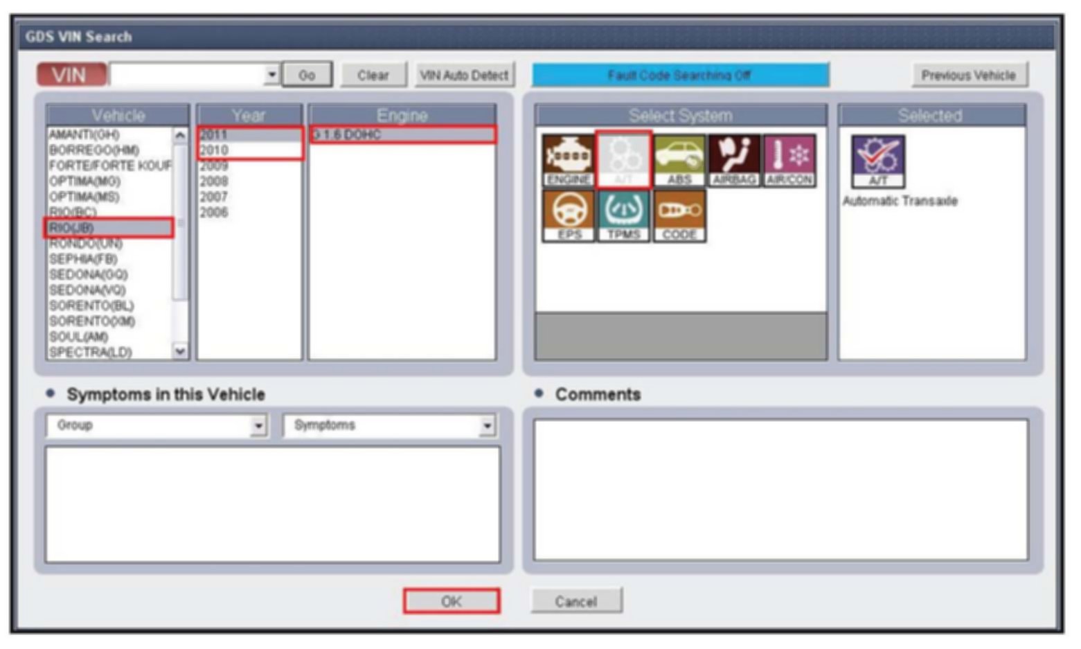 5. With the ignition key ON, turn ON the VCI and GDS tool. Access the GDS vehicle identification number (VIN) screen and configure the vehicle using the VIN AUTO DETECT Function.