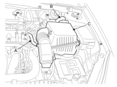 4. Disconnect the breather hose (A), ECM connector (B) and remove the air cleaner assembly (C).
