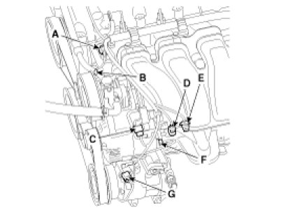 9. Disconnect the intake OCV connector (A), power steering switch connector (B), VIS connector (C), OPS connector (D), knock sensor connector (E), alternator connector (F) and A/C switch connector (G).
