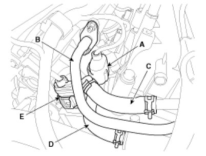 13. Connect the PCSV connector (A), ECTS connector (B), condenser connector (C), CKP sensor connector (D), exhaust CMP sensor connector (E) and brake booster vacuum hose (F).