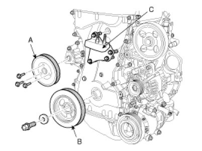 9. Remove the water pump pulley (A), crankshaft pulley (B) and engine support bracket (C).