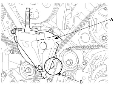 2. Install the tensioner arm assembly(A) and the idler(B).
