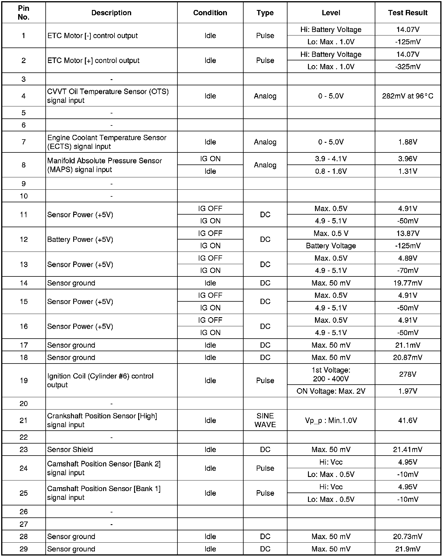 Pinout Values and Diagnostic Parameters