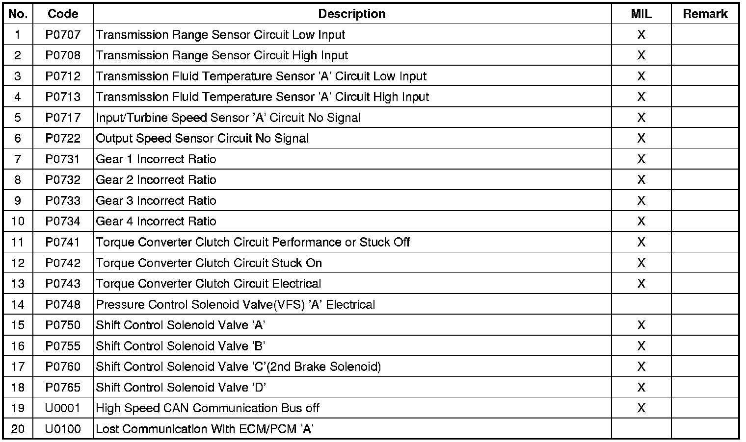 Diagnostic Trouble Code Table