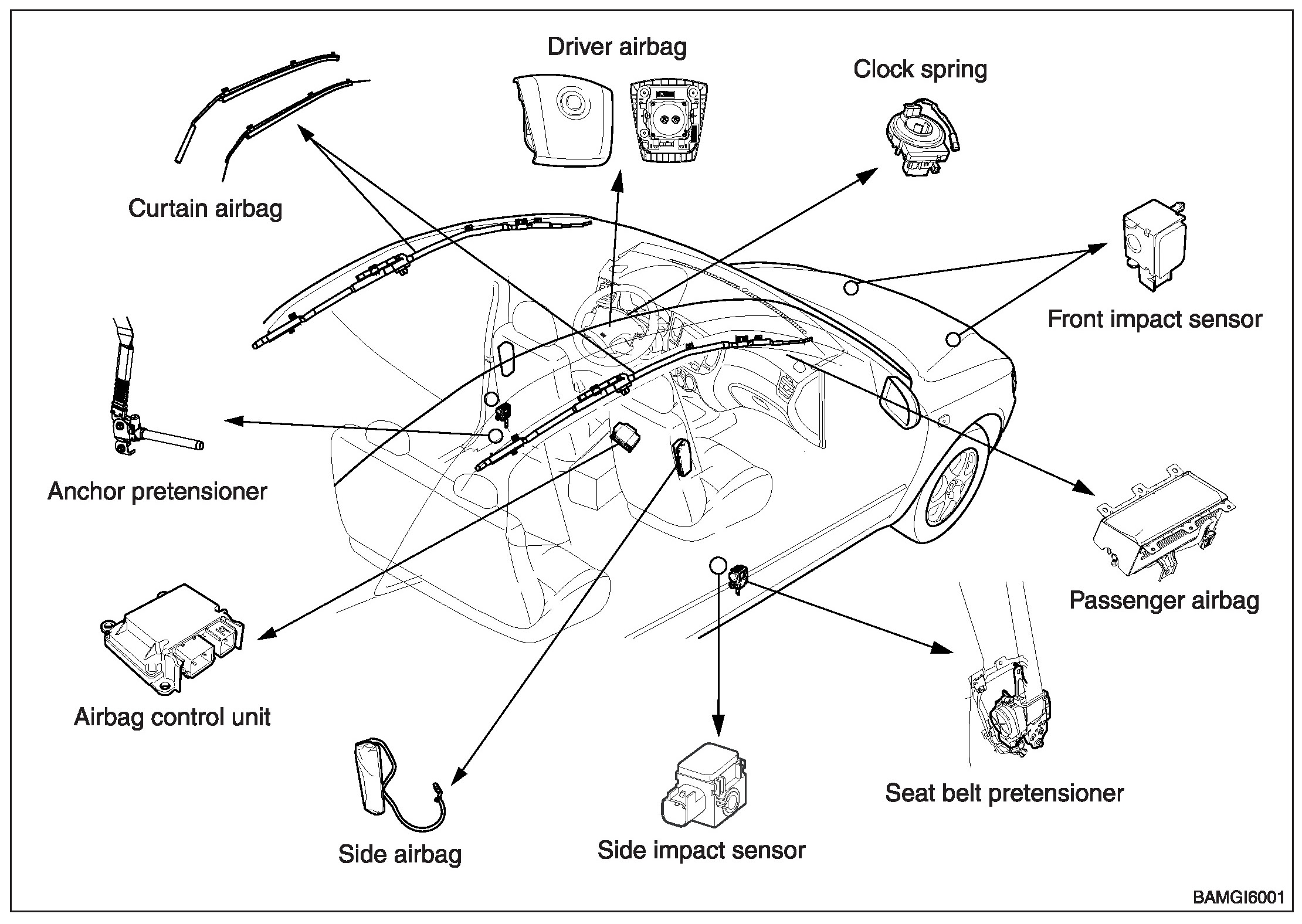 When handling airbag components (removal, installation or inspection, etc.), always follow the directions given in the repair manual for the relevant model to prevent the occurrence of accidents and airbag malfunction.