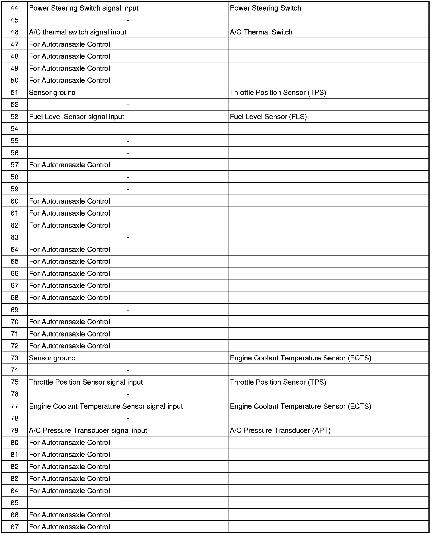 ECM Terminal Input/Output Signal (A/T)