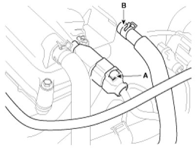 13. Disconnect the positive crankcase ventilation(PCV) hose(A) and PCSV hose(B).