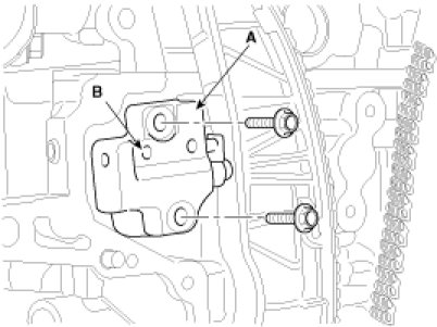 22. Remove the timing chain tensioner arm(A) and guide(B).