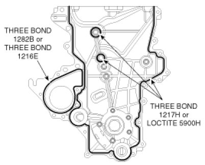 (3) Apply the liquid gasket, THREE BOND 1282B or THREE BOND 1216E on the water pump contact parts of the timing chain cover and THREE BOND 1217H or LOCTITE 5900H on the rest parts. Reassemble the cover(A) within 5 minutes.