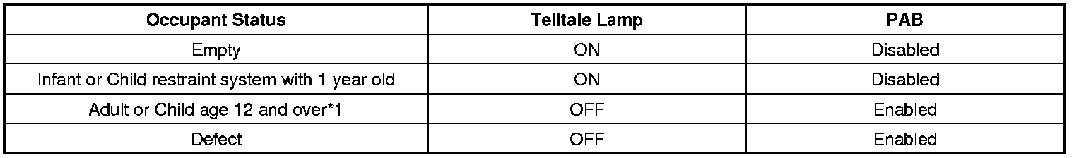 The Telltale Lamp indicates the Passenger Airbag(PAB) enabled and disabled status based on occupant status of passenger seat. If the passenger seat is empty or occupied with infant or child restraint system with 1 year old child, the Passenger Airbag is disabled and the Telltale Lamp is turned ON to inform the driver that the PAB is disabled. As soon as operating voltage is applied to the SRSCM ignition input, the SRSCM activates telltale lamp turn.