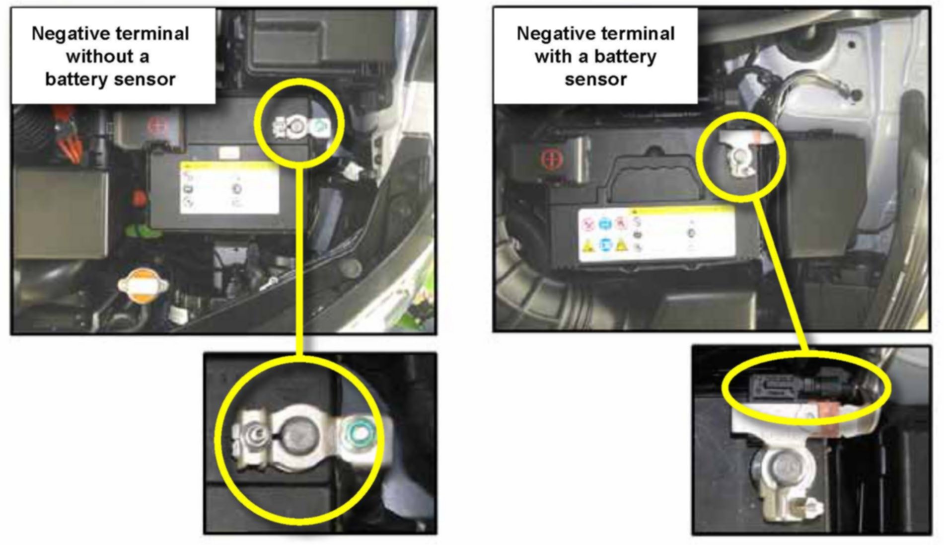 This bulletin provides information relating to vehicles equipped with a battery sensor. This bulletin is issued to emphasize not to install an additional ground cable to the battery on any vehicles equipped with a battery sensor. Installing an additional ground cable to a battery (-) terminal may cause the battery sensor to incorrectly recognize the battery state (charged/discharged) and temperature information. Therefore, please advise customers not to install an additional battery ground cable, and emphasize the fact that a vehicle repair caused by the additional battery around cable will not be covered under warranty.