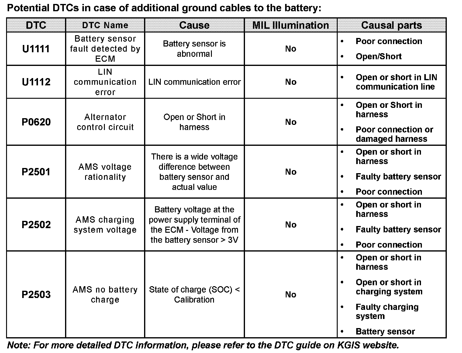 If an additional ground cable is installed on the battery (-) terminal, the battery sensor may incorrectly register that the battery is in a discharged state despite a normal battery condition. This may cause the battery sensor to transmit incorrect information to the ECM, alternator voltage output, and ISG control, resulting in improper operation of various systems and components, as well as possibly setting DTCs as shown below: