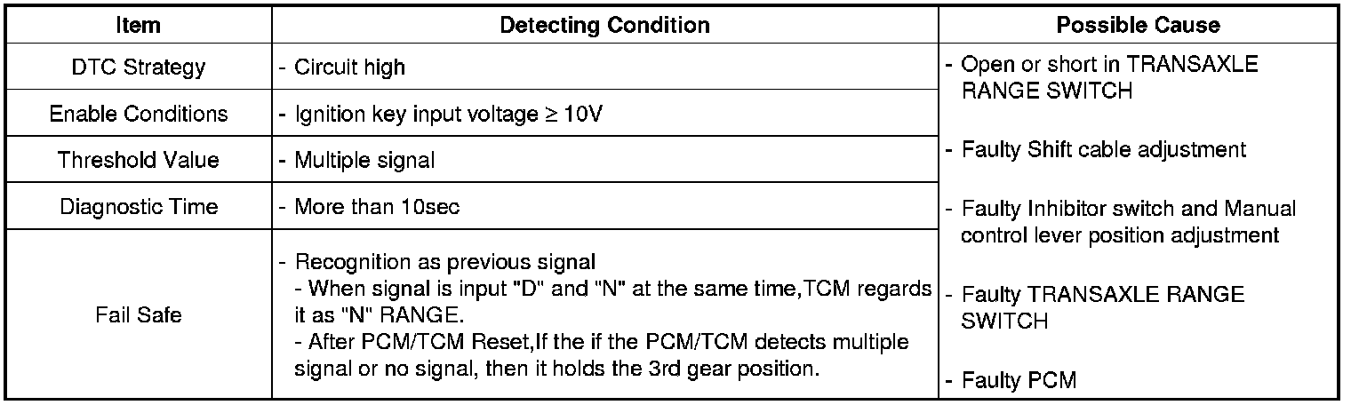 The TCM sets this code when the Transaxle Range Switch outputs multiple signals for more than 10 seconds.