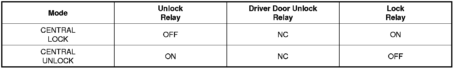 (8) Output Driver Unlock Relay once only for 1s when Driver Door open Switch is closed within 0.5s since Driver Door Unlock Switch is changed from UNLOCK to LOCK during KEY IN = ON(North America SPEC ONLY).