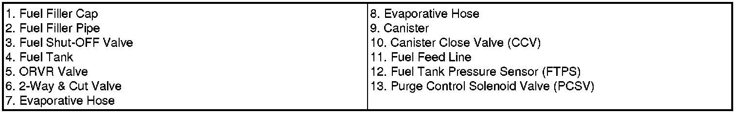 This system consists of a fill vent valve, fuel shut-off valve, fuel cut valve (for roll over), two way valve (pressure/vacuum relief), fuel liquid/vapor separator which is installed beside the filler pipe, charcoal canister which is mounted under the rear floor LH side member and protector, tubes and miscellaneous connections.