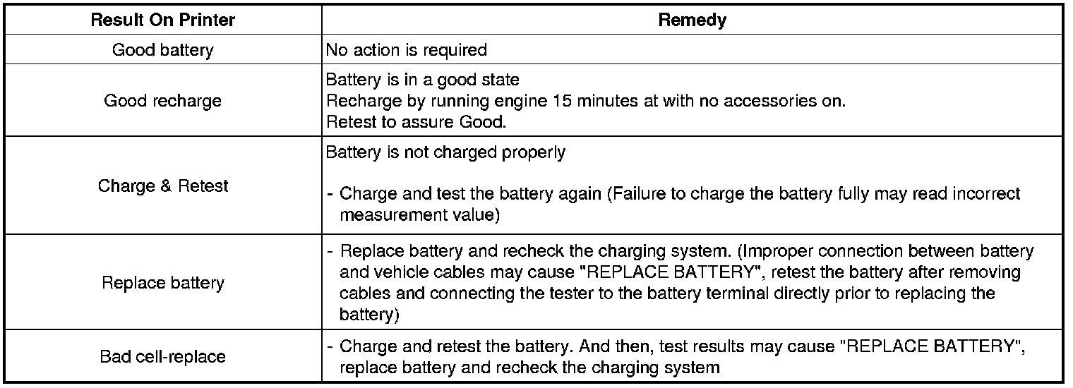 A relevant action must be given according to the test results by referring to the battery test results as shown in the table below.