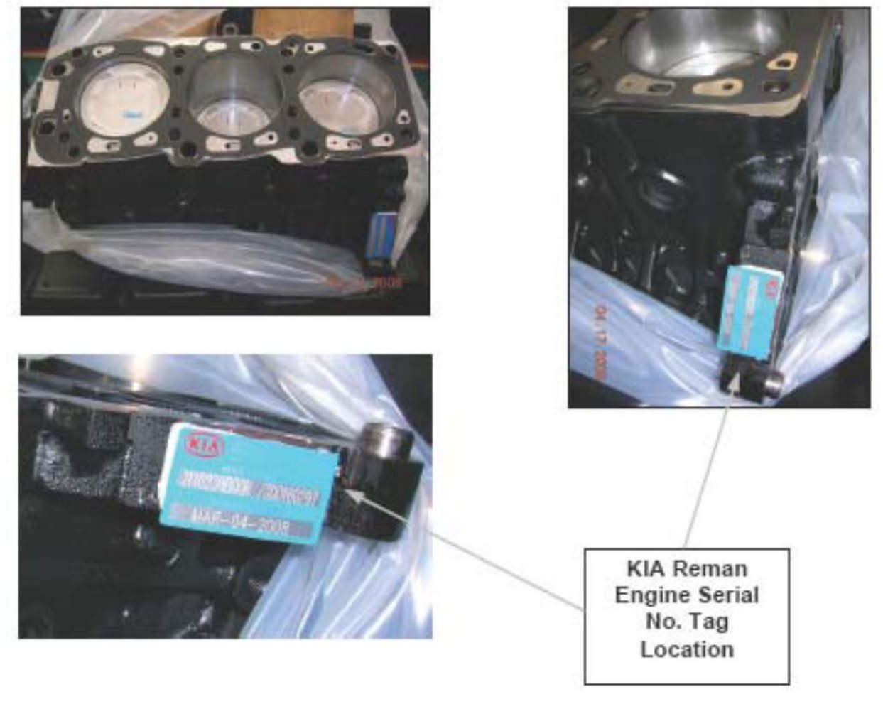 These examples show Kia Reman Engine Serial No. tag location. Refer to Kia's electronic service information for OEM serial number location.