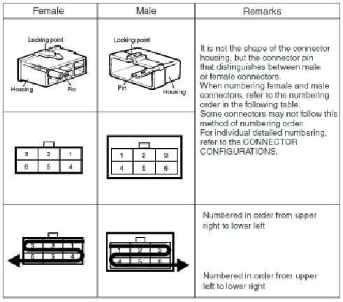 - It shows the front of the connector on the harness side when not to the harness connector. The terminal number on each connector can be obtained by following the pattern used in (5) connector view and numbering order. Unused terminals are marked with an asterisk (*).
