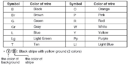 The following abbreviations are used to identify wire colors in the circuit schematics.