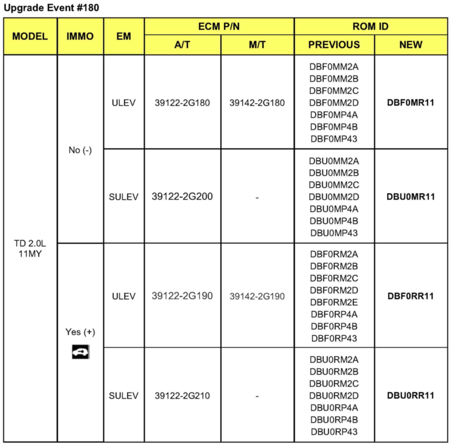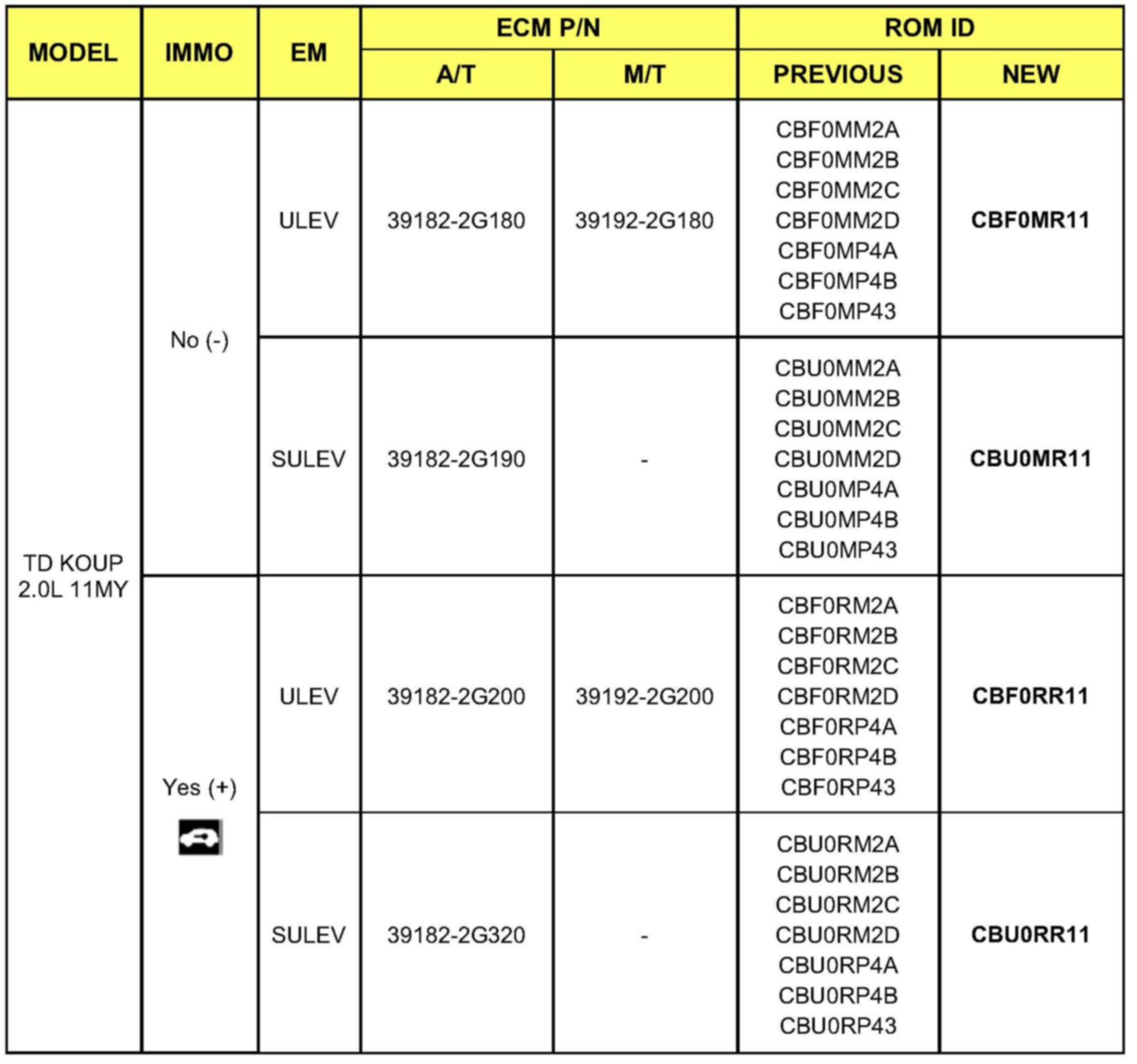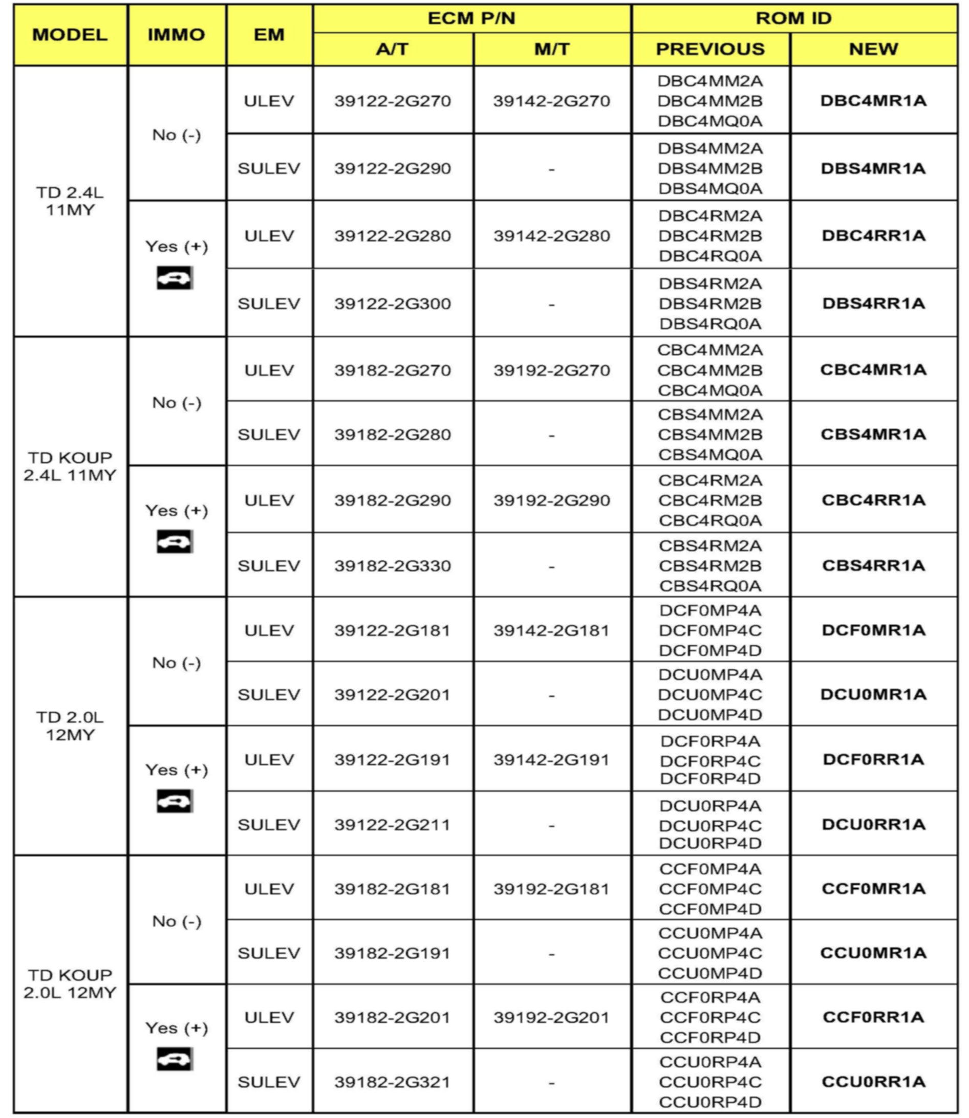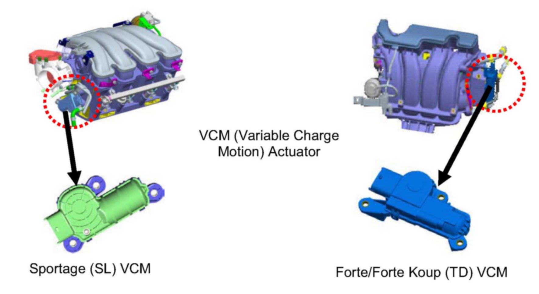This bulletin provides information related to the VCM (Variable Charge Motion) actuator replacement and the ECM software upgrade of some 2011-2012MY Forte/Forte Koup (TD) 2.0/2.4L vehicles produced from August 19, 2010 to May 31, 2011 / June 1, 2011 to August 10, 2011, and some 2011MY Sportage (SL) 2.4L vehicles produced from June 10, 2010 to March 10, 2011 which may experience a MIL (Malfunction Indicator Lamp) illuminated with the ECM (Electronic Control Module) system-related DTC P200A. To correct this condition, the VCM actuator needs to be replaced and the ECM should be reprogrammed using the GDS download as described in this bulletin. For confirmation that the latest reflash has been done to a vehicle you are working on, verify ROM ID using the tables in this TSB.