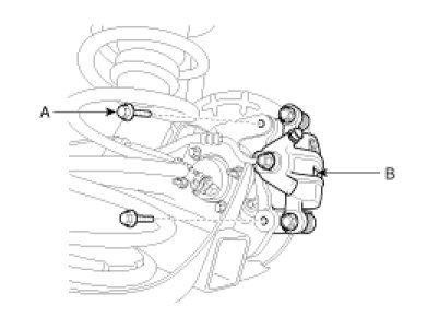 3. Remove the brake caliper mounting bolts (A), and then place the brake caliper assembly (B) with wire as shown in the illustration.