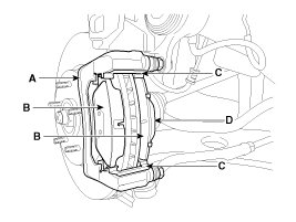 1. Check the pad wear. Measure the pad thickness and replace it, if it is less than the specified value.