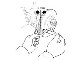 1. Place a dial gauge about 5mm (0.2 in.) from the outer circumference of the brake disc, and measure the runout of the disc.