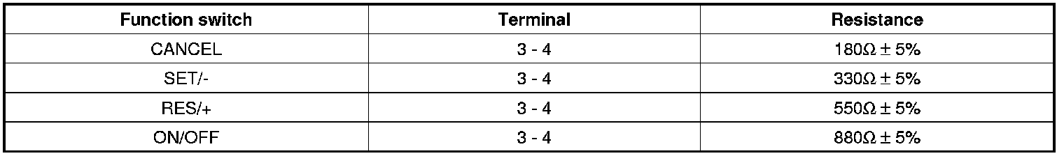 2. Measure resistance between terminals on the control switch when each function switch is ON (switch is depressed).
