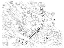 24. Connect PCSV (Purge control solenoid valve) connector (A) and tighten the vacuum pipe assembly mounting bolts and nut.