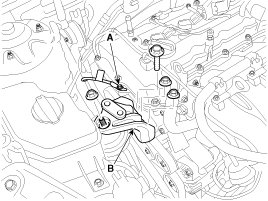 21. Install the front engine hanger (B) and then connect the PCV (Positive crankcase ventilation) hose (A).