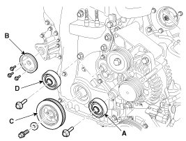 13. Install the idler (A), the water pump pulley (B), the crankshaft pulley (C) and the drive belt tensioner pulley (D).