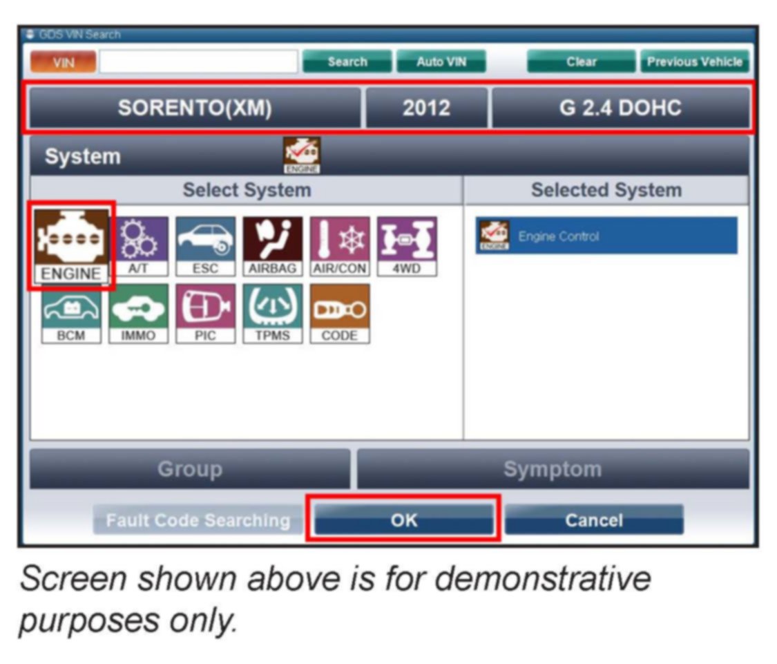 5. With the ignition key ON (DO NOT start the engine!), turn ON the VCI and GDS tool. Access the GDS vehicle identification number (VIN) screen and configure the vehicle using the VIN AUTO DETECT Function.