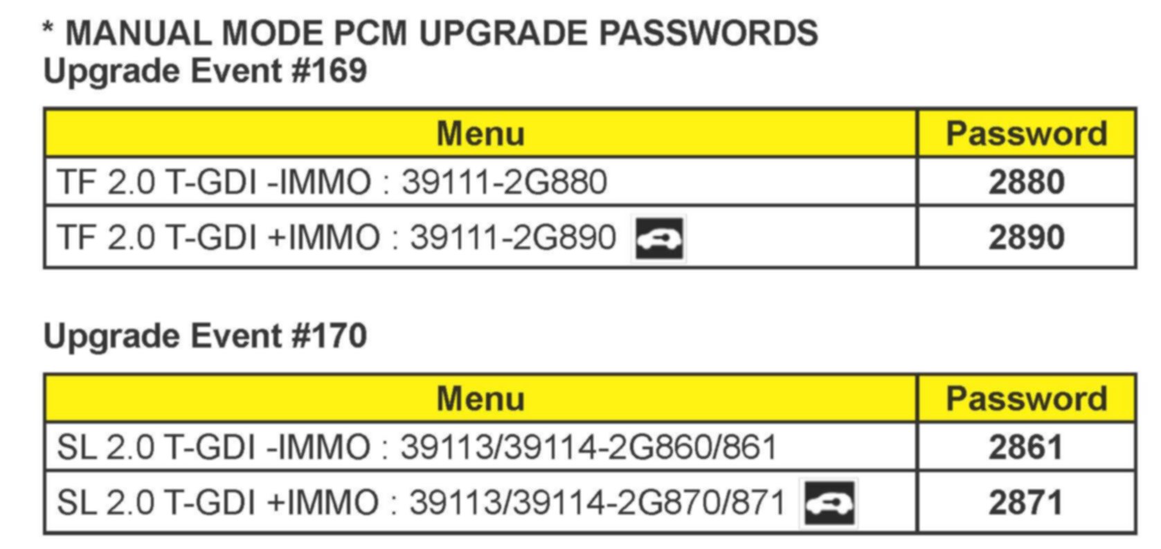 * MANUAL MODE PCM UPGRADE PASSWORDS